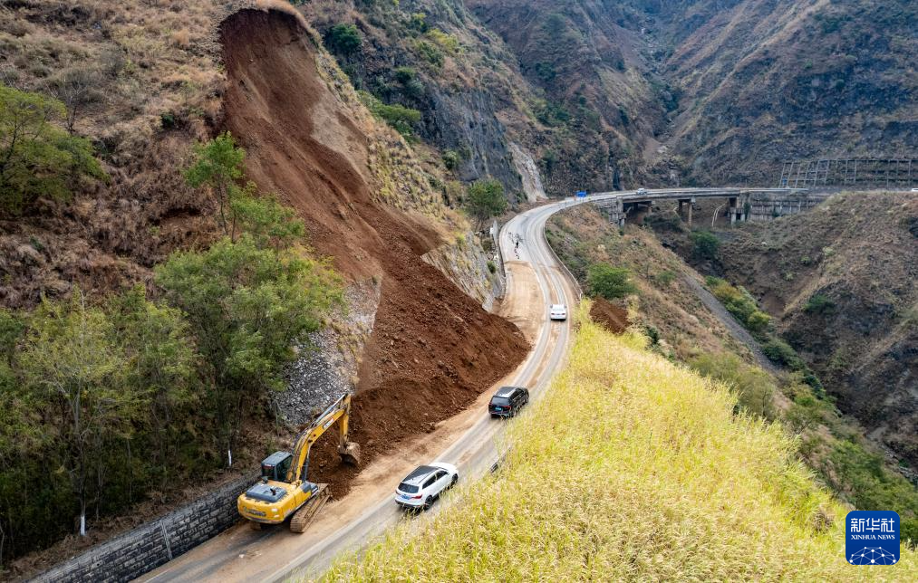 正在进行抢通作业的巧家县境内昭巧二级公路滑坡路段实行单边限制性通行(1月20日摄,无人机照片)。
