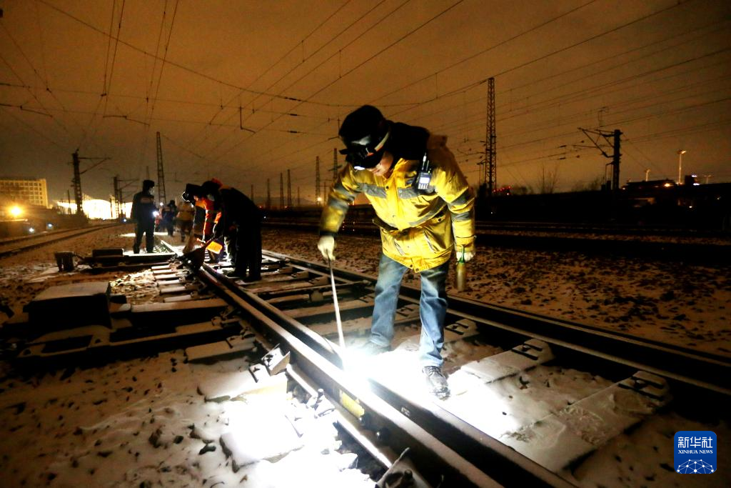 1月20日凌晨,在江苏连云港东站沿线,工人清除道岔轨道上的冰雪。