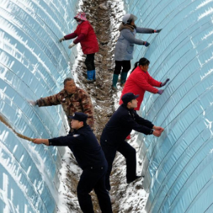 1月19日,江苏省宝应县公安局泾河派出所民警在钱庄村帮助农户清除温棚上的积雪。
