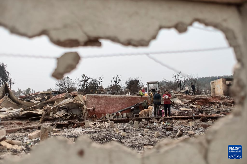 1月19日,当地居民在智利比奥比奥大区彭科市的火灾受灾区域进行清理。