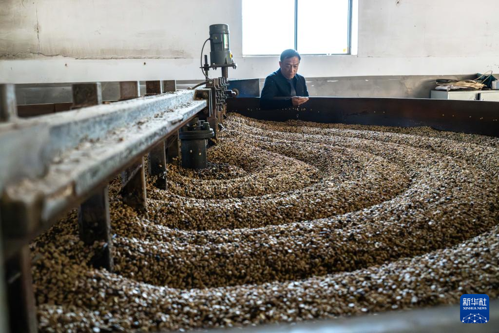 1月23日,咖农在临沧市双江县沙河乡陈家寨村云顶筑巢咖啡庄园晾晒咖啡豆。