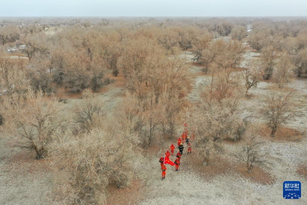 1月23日,在新疆巴音郭楞蒙古自治州尉犁县胡杨林区,乌鲁木齐消防救援机动支队库尔勒大队联合尉犁县消防救援局与护林员进行携装巡护(无人机照片)。