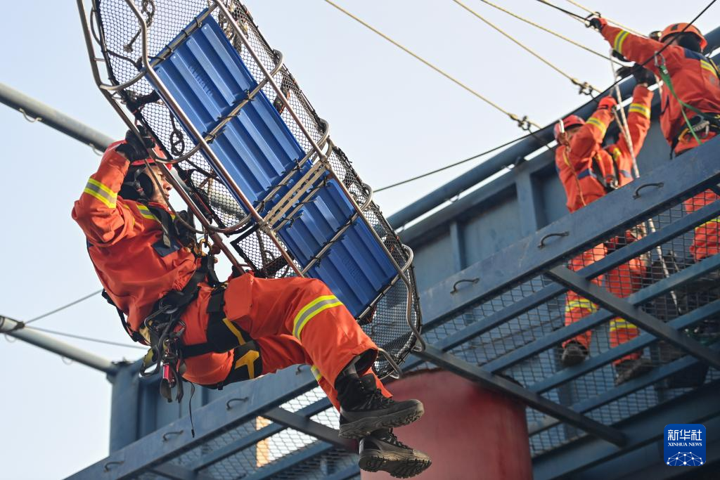 1月22日,在新疆乌鲁木齐消防救援机动支队库尔勒大队,消防员在绳索训练场地进行T型救援训练,模拟救援悬崖下一名被困人员。
