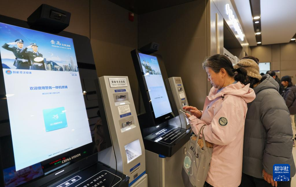 1月24日,在天津市公安局出入境服务大厅,市民使用智能签注设备办理业务。