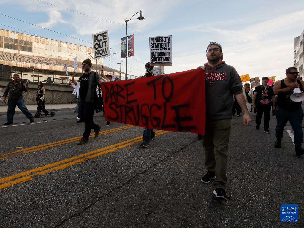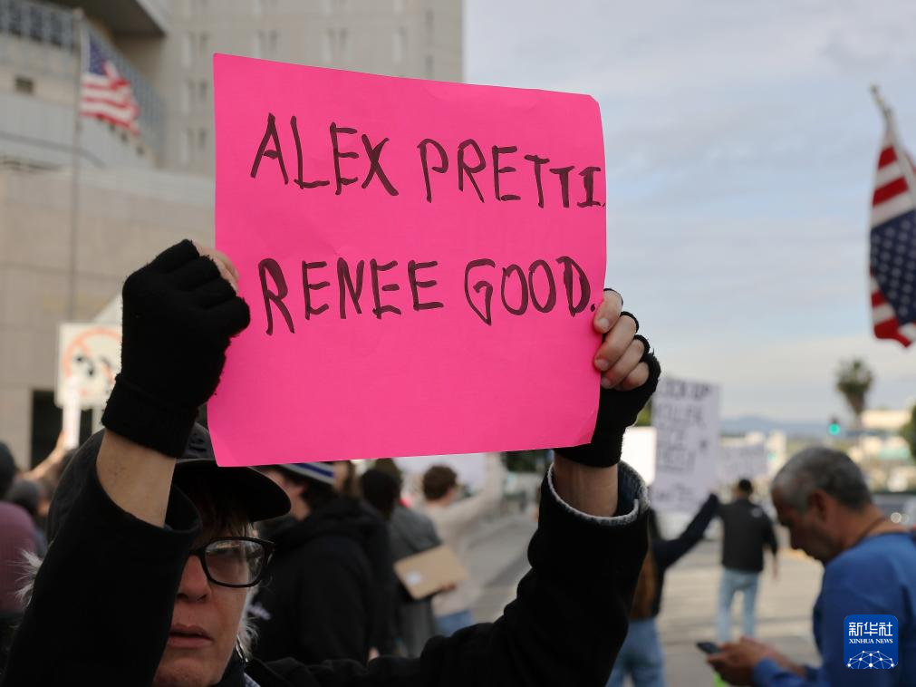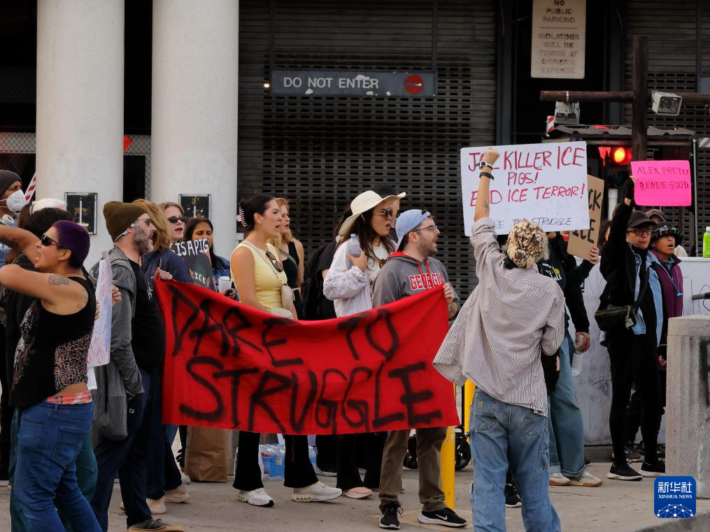 1月25日,人们在美国加利福尼亚州洛杉矶的大都会拘留中心附近参加示威抗议。