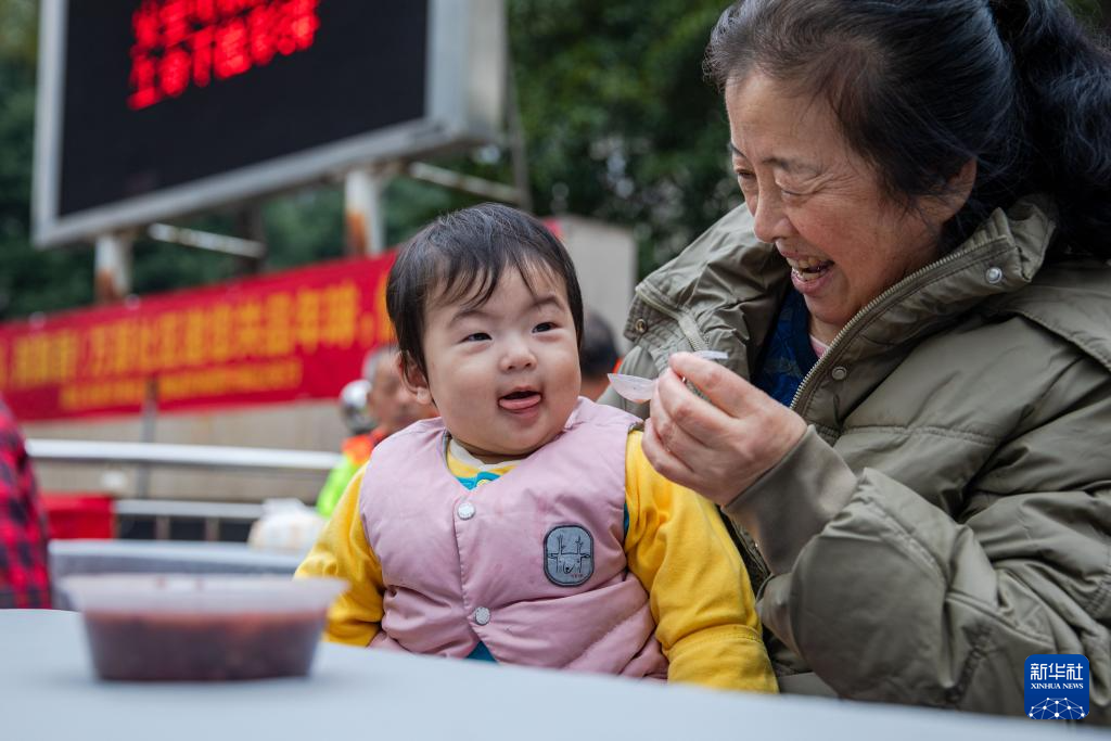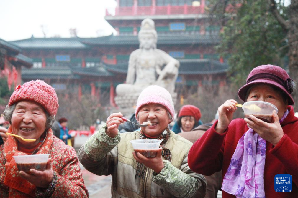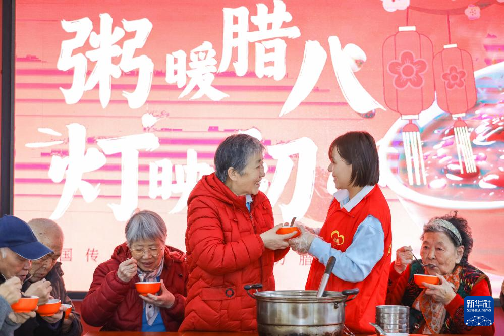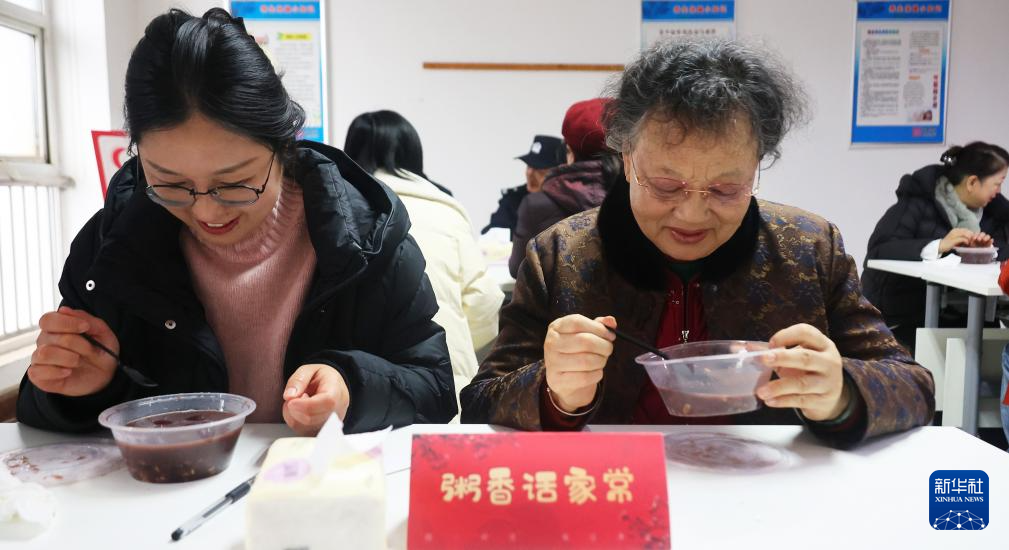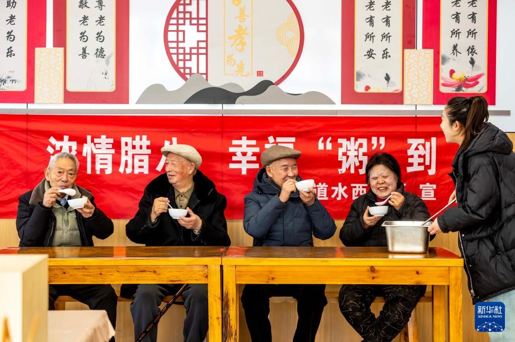 1月26日,在贵州省黔西市水西街道水西社区,老年人在品尝腊八粥。