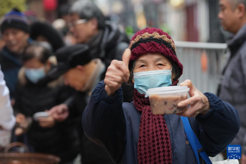 1月26日,一名老人在杭州河坊街方回春堂领取腊八粥后竖起大拇指。