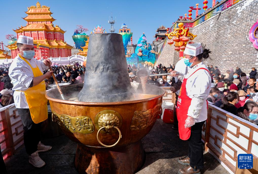 1月26日,在宁夏固原市隆德县民俗文化节现场,工作人员熬制腊八粥。