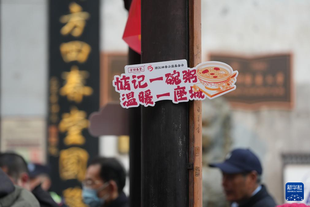 1月26日早晨,在浙江省金华市市区,当地总工会和爱心公益协会工作人员在街边给户外劳动者和市民免费发放腊八粥。