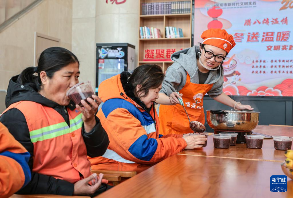 1月26日,在浙江省台州市仙居县城区一家工会驿站内,志愿者为环卫工人送上腊八粥。