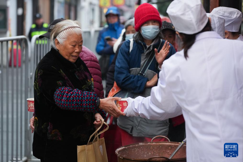 1月26日,市民在杭州河坊街方回春堂排队领取腊八粥。