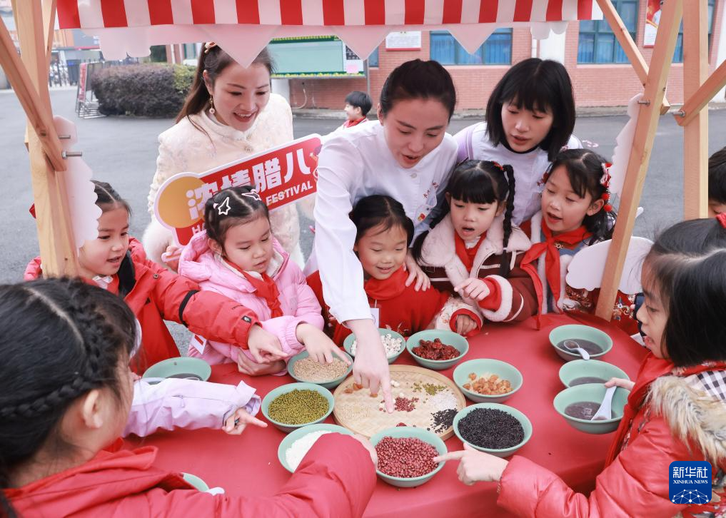 1月26日,在湖北省武汉市洪山区未来实验小学,老师教学生识别制作腊八粥的食材。