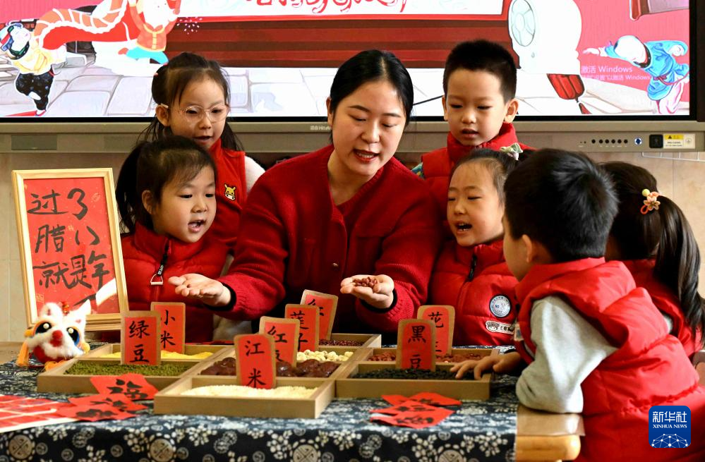 1月26日,在天津市滨海新区可爱蜗幼儿园,小朋友们在辨认制作腊八粥的食材。