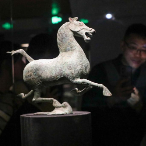 1月26日晚,在甘肃省博物馆二楼丝绸之路文明展厅,观众观看铜奔马(复制品)。