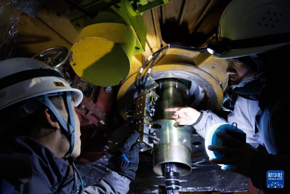 1月24日,工作人员李强(右)和田冬在卫星数据接收系统方位舱进行设备维护。