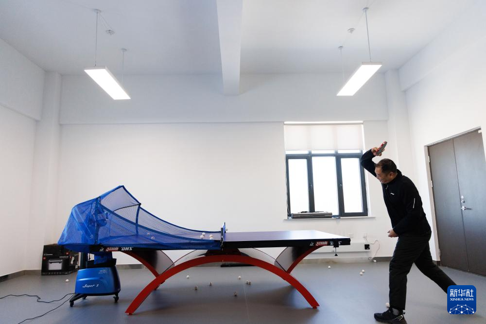 1月25日,漠河站站长施胜浦在活动室打乒乓球。活动室配备了发球机,方便站里只有一人值守时活动。