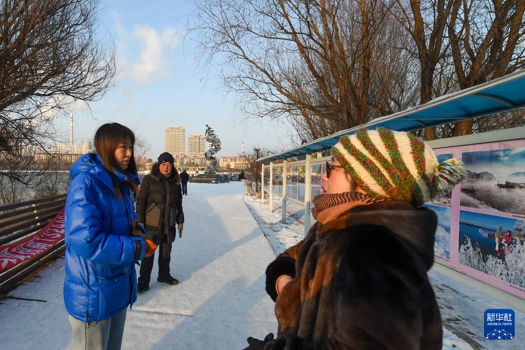 1月28日,游客在长白岛浏览鸟类宣传海报。