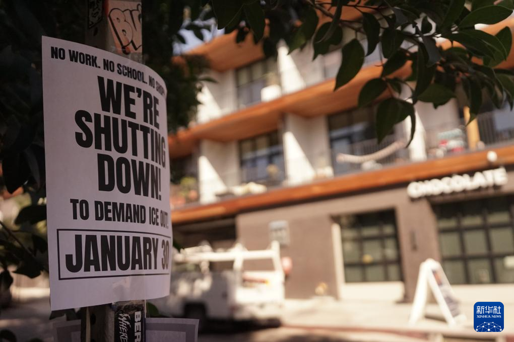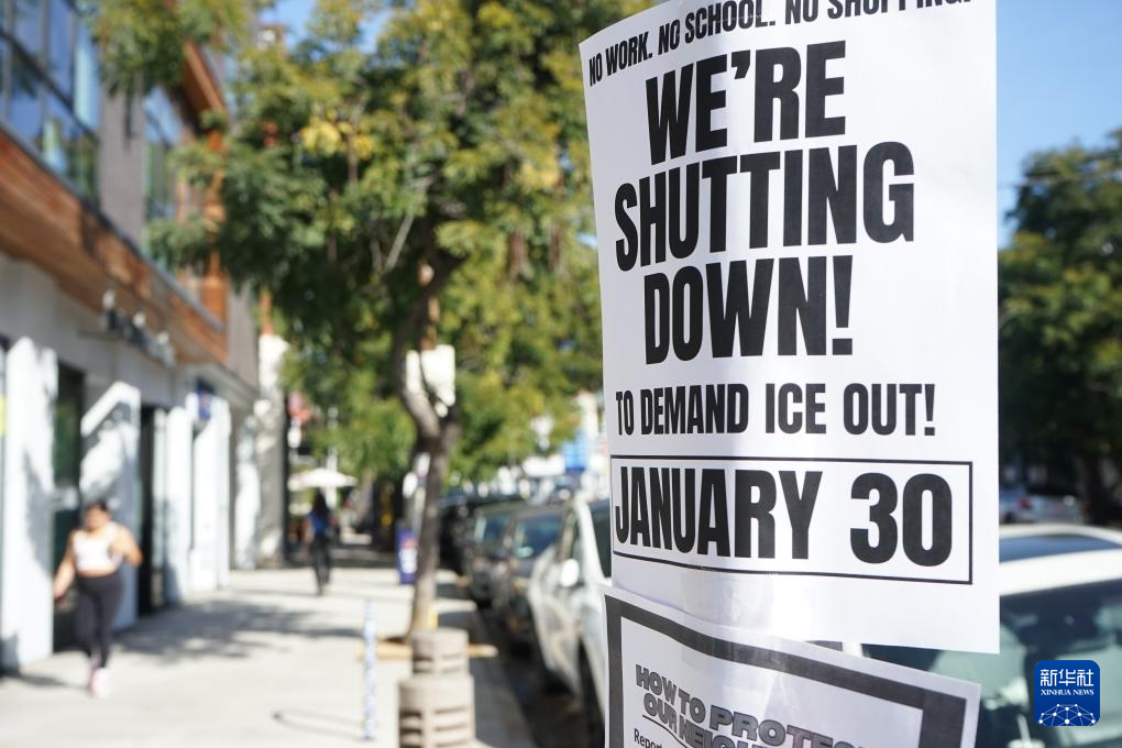 这是1月30日在美国加利福尼亚州洛杉矶拍摄的响应“全国停摆”活动的贴纸。此前,美国反对特朗普政府暴力移民执法的抗议组织发布声明,呼吁民众参加30日举行的“全国停摆”活动,用“不上班、不上学、不购物”方式抗议特朗普政府暴力移民执法以及联邦执法人员在明尼阿波利斯市射杀两名美国公民古德和普雷蒂。