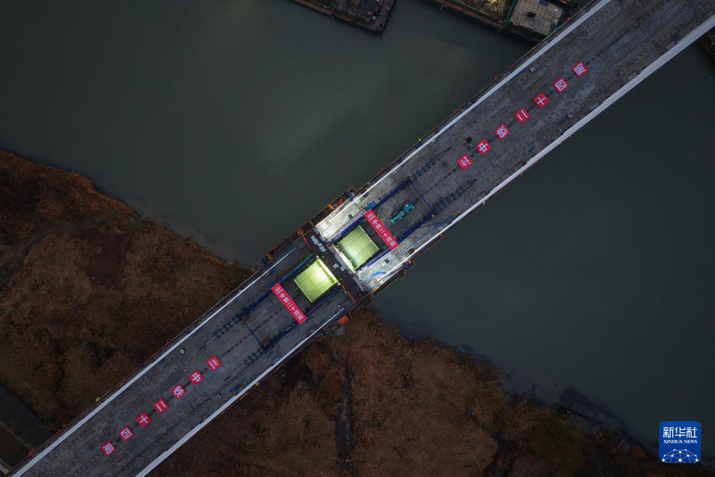 1月30日拍摄的杭州至德清市域铁路跨东苕溪斜拉桥合龙施工现场(无人机照片)。