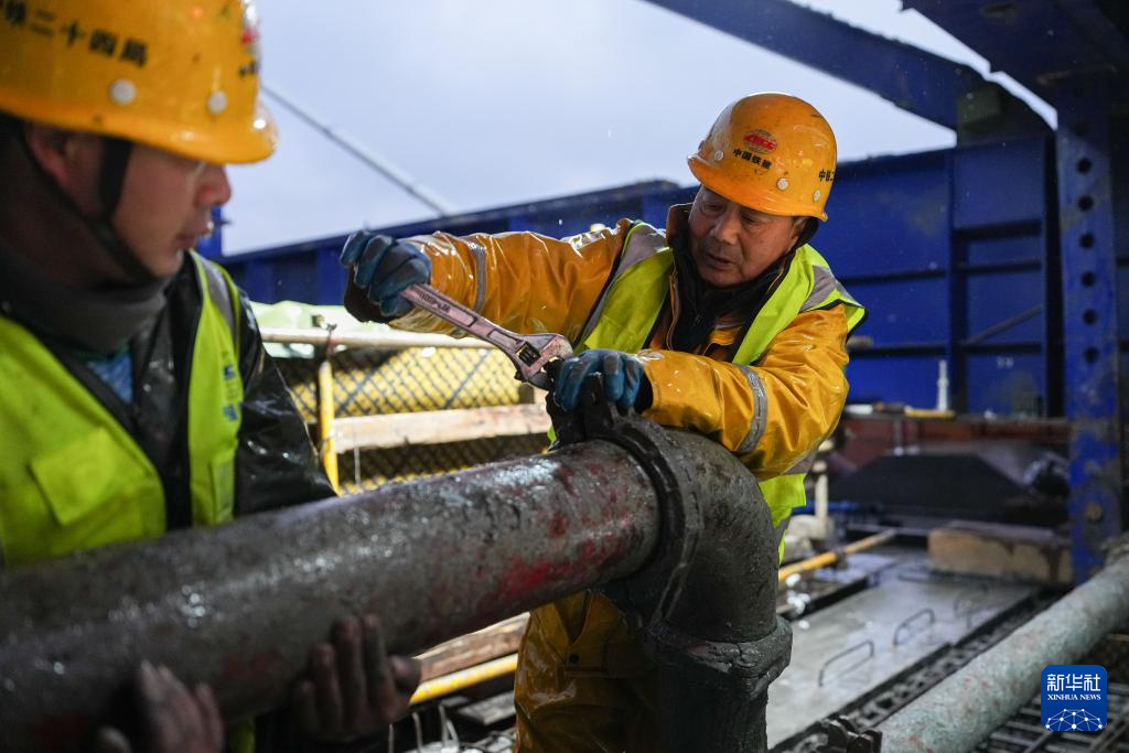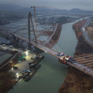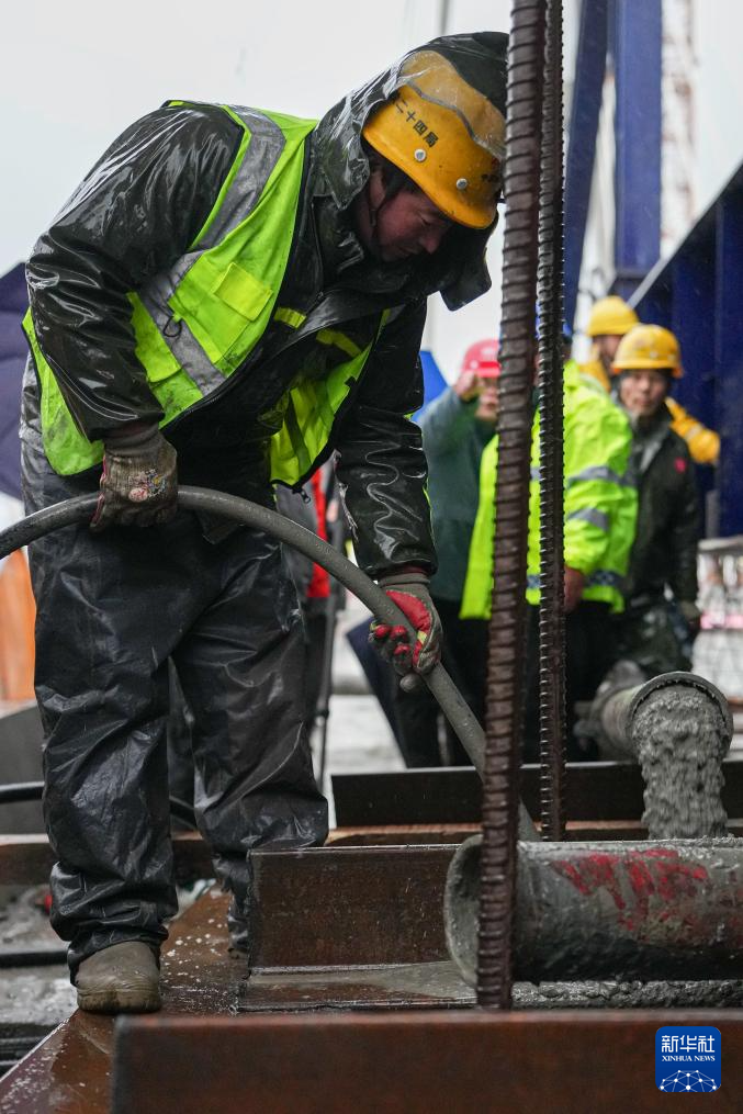 1月30日,中铁二十四局建设者在杭州至德清市域铁路跨东苕溪斜拉桥合龙施工现场作业。