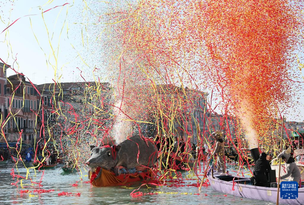 2月1日,在意大利威尼斯,“大老鼠”船释放彩纸庆祝狂欢节。