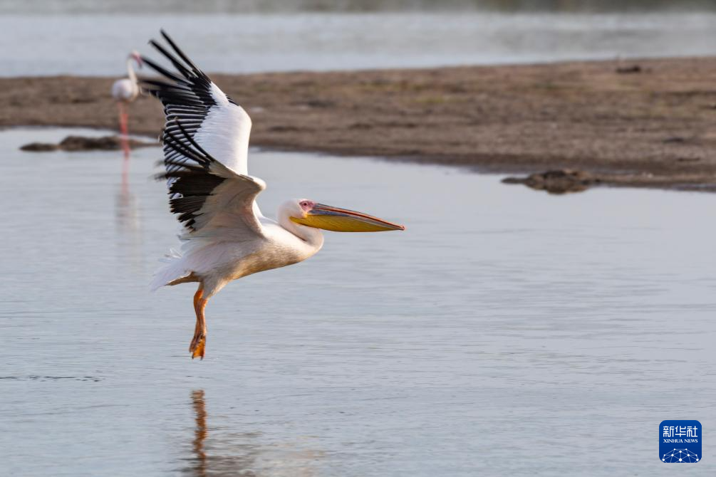 1月8日,在肯尼亚卡贾多郡,一只鹈鹕飞过安博塞利湖湖面。