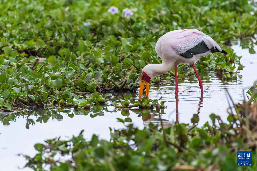 2月1日,在肯尼亚纳库鲁郡,一只黄嘴鹳在奈瓦沙湖觅食。