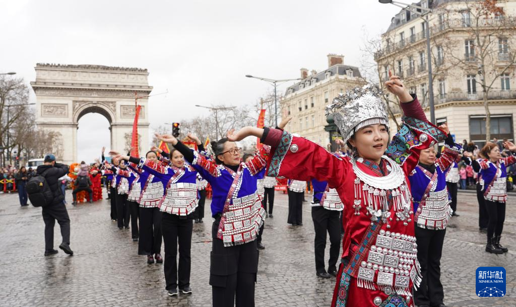 2月1日,在法国首都巴黎的香榭丽舍大街,人们在巡游活动上表演苗族传统舞蹈。