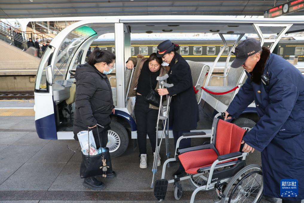 2月2日,北京站京铁爱心服务组的值班员杜京林(右二)在服务重点旅客。
