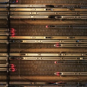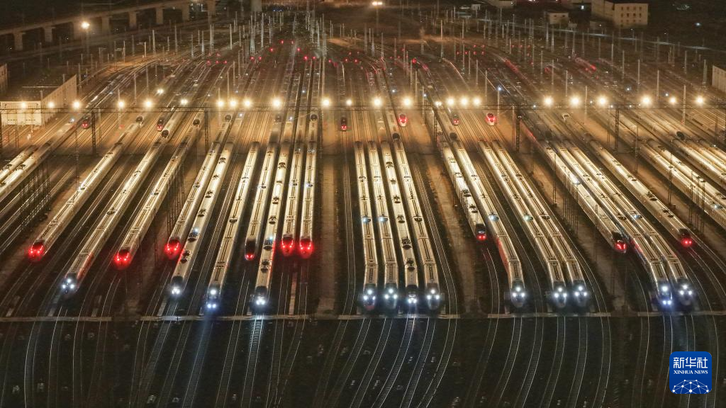 2月2日,列车在天津动车客车段天津动车运用所停车场整装待发(无人机照片)。