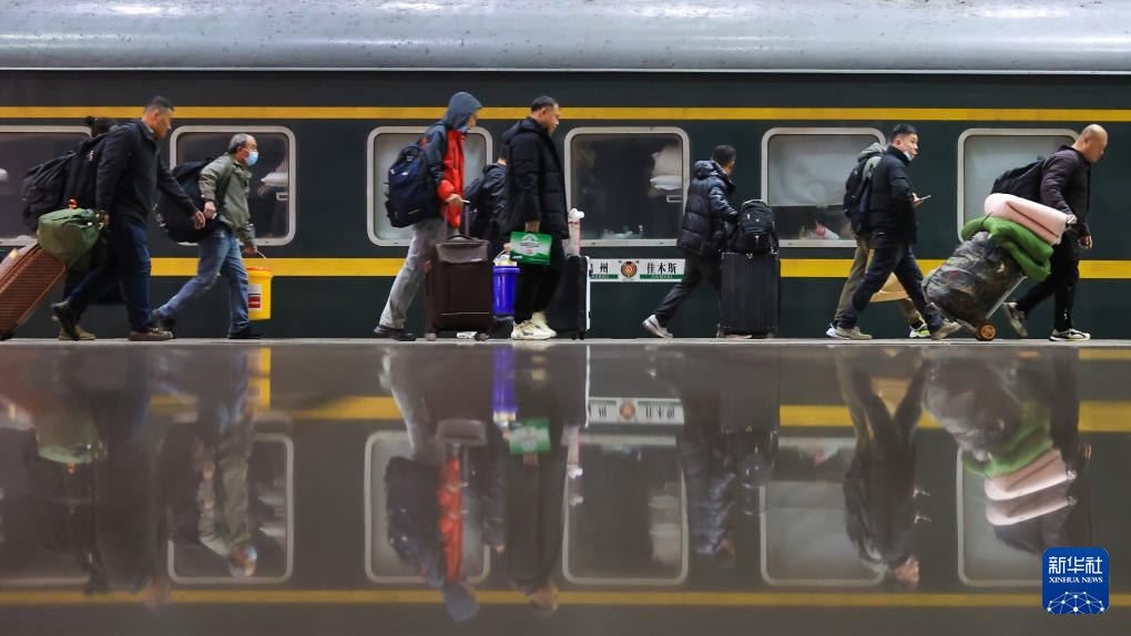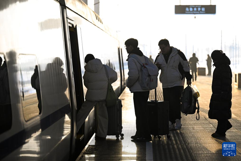 2月2日,在乌鲁木齐站,旅客在排队上车。