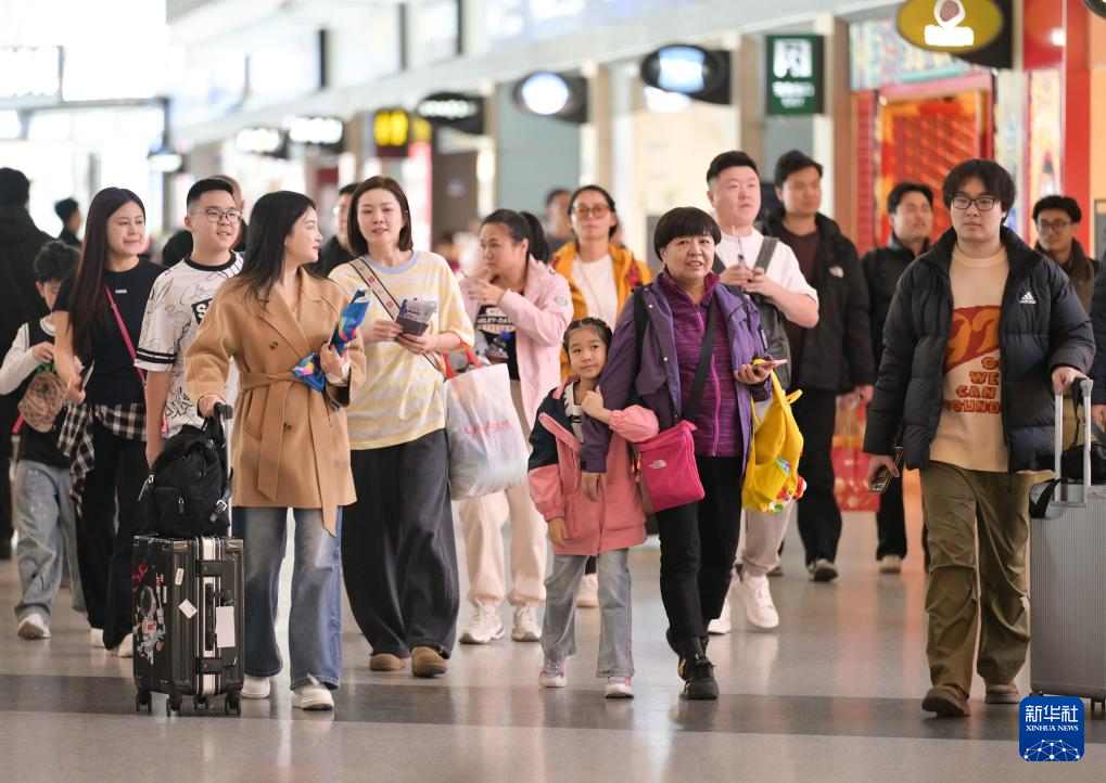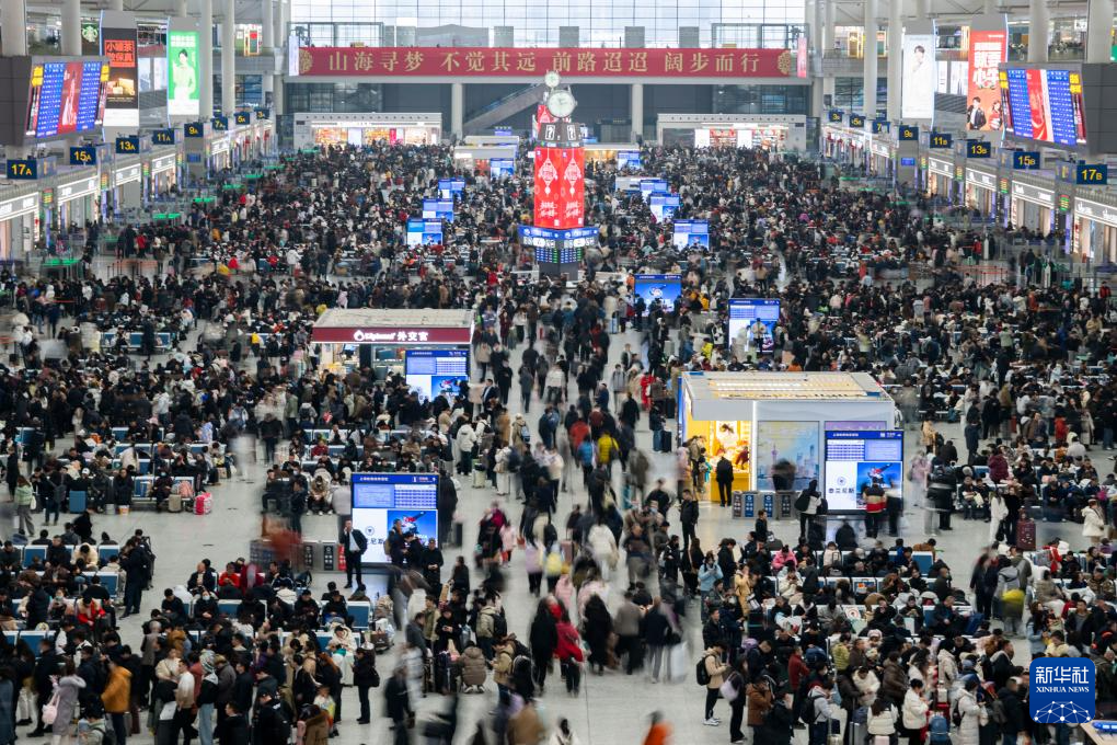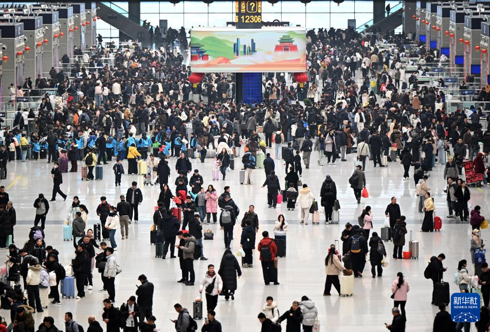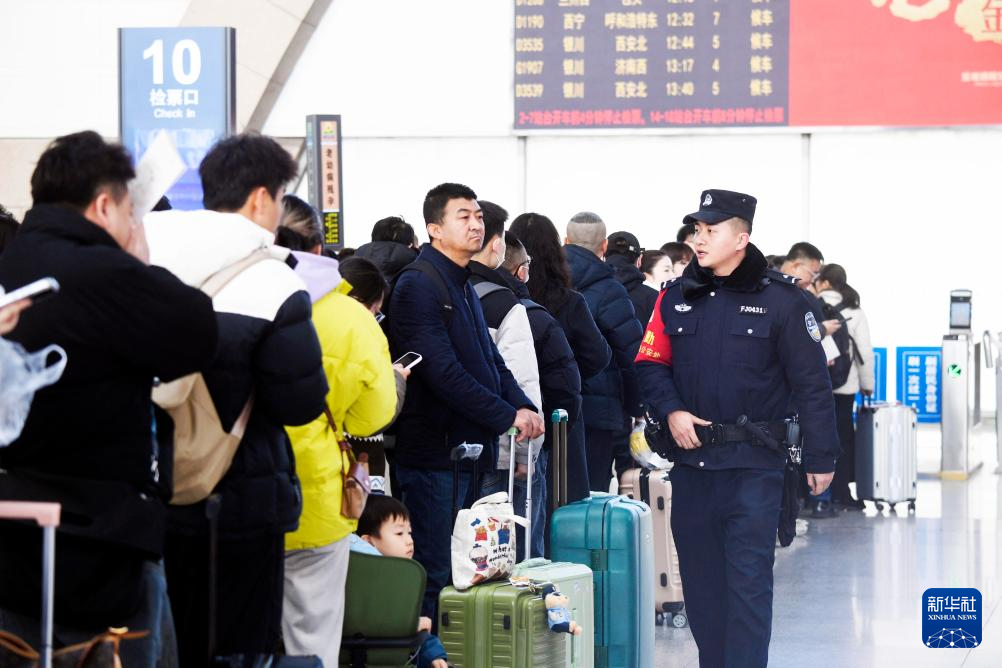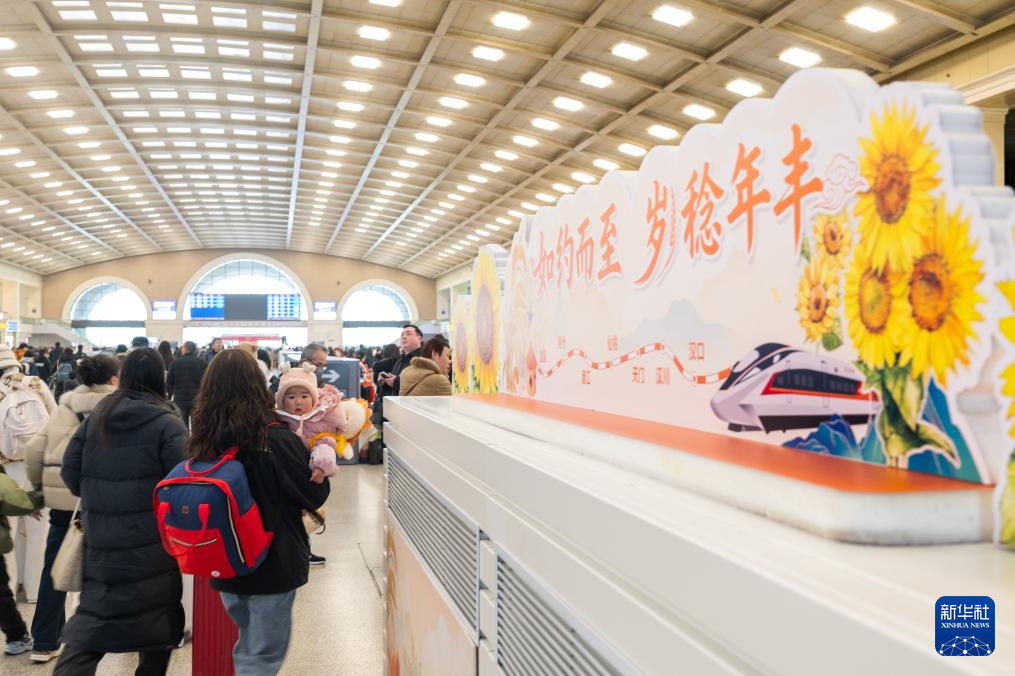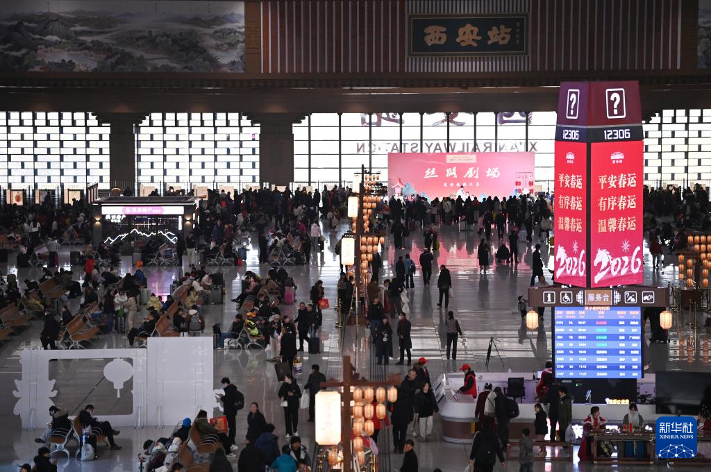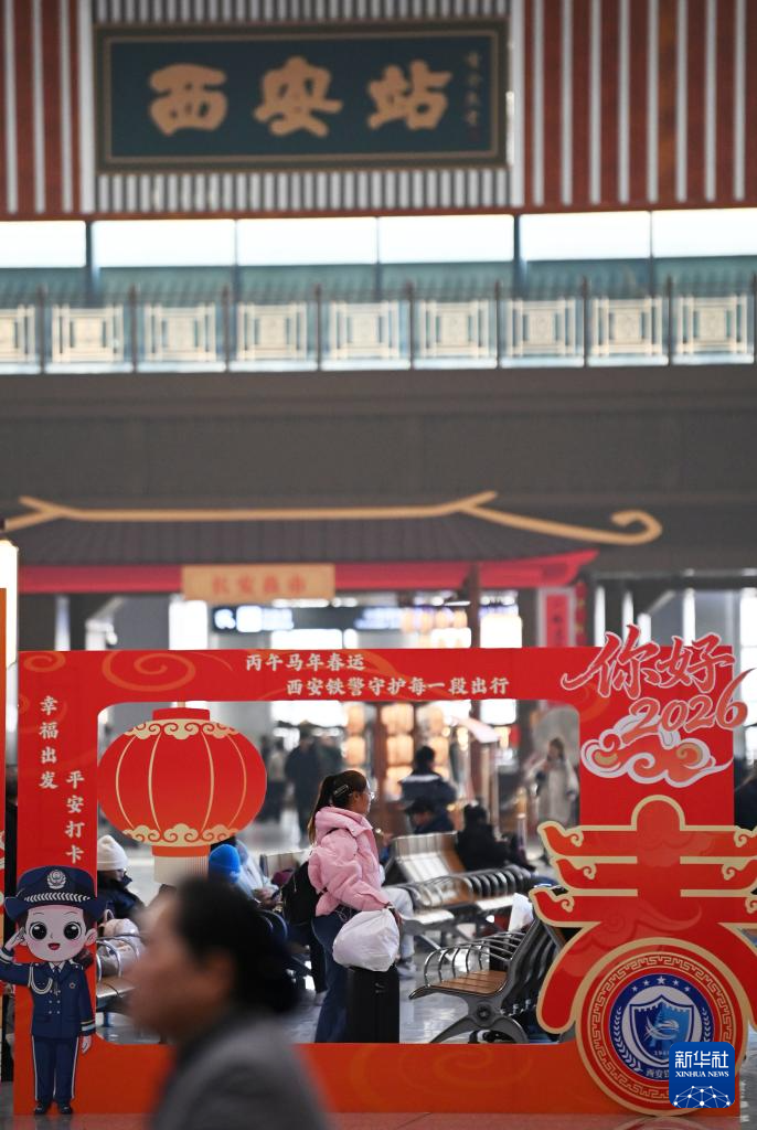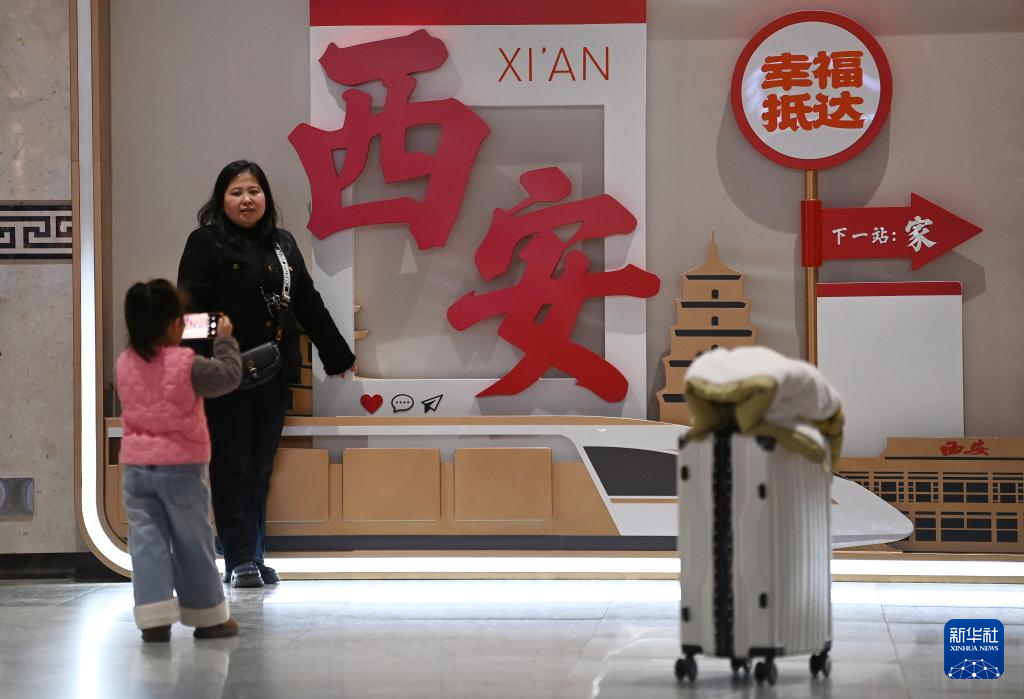 2月2日,旅客在西安站候车大厅的主题文化墙前留影。