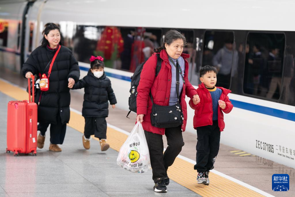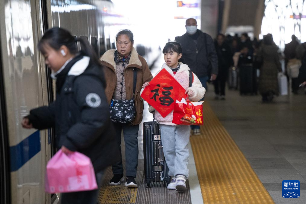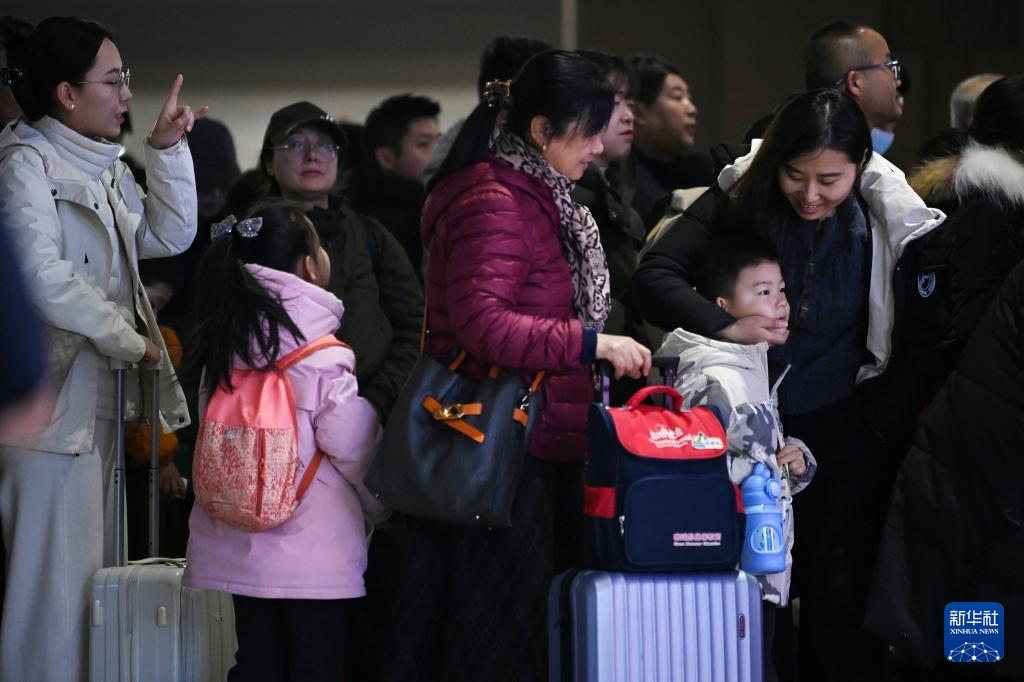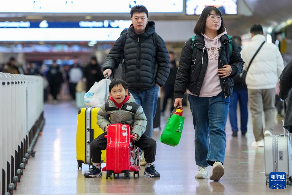 2月2日,在北京西站,小朋友(前左)跟随家长进站乘车。