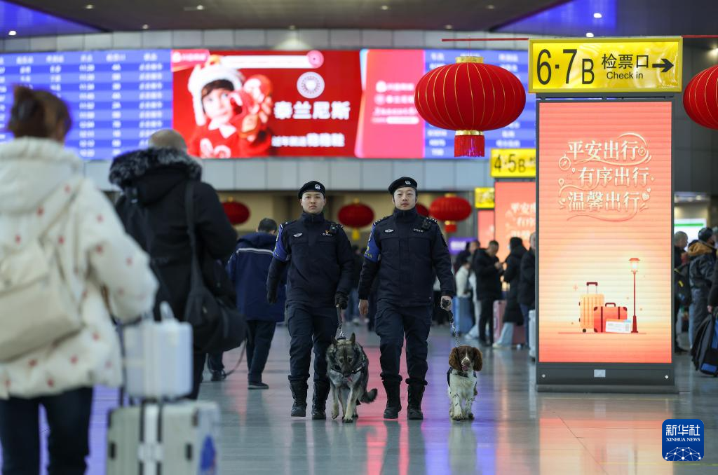 2月2日,天津铁路公安处特警在天津站候车厅巡逻值守。