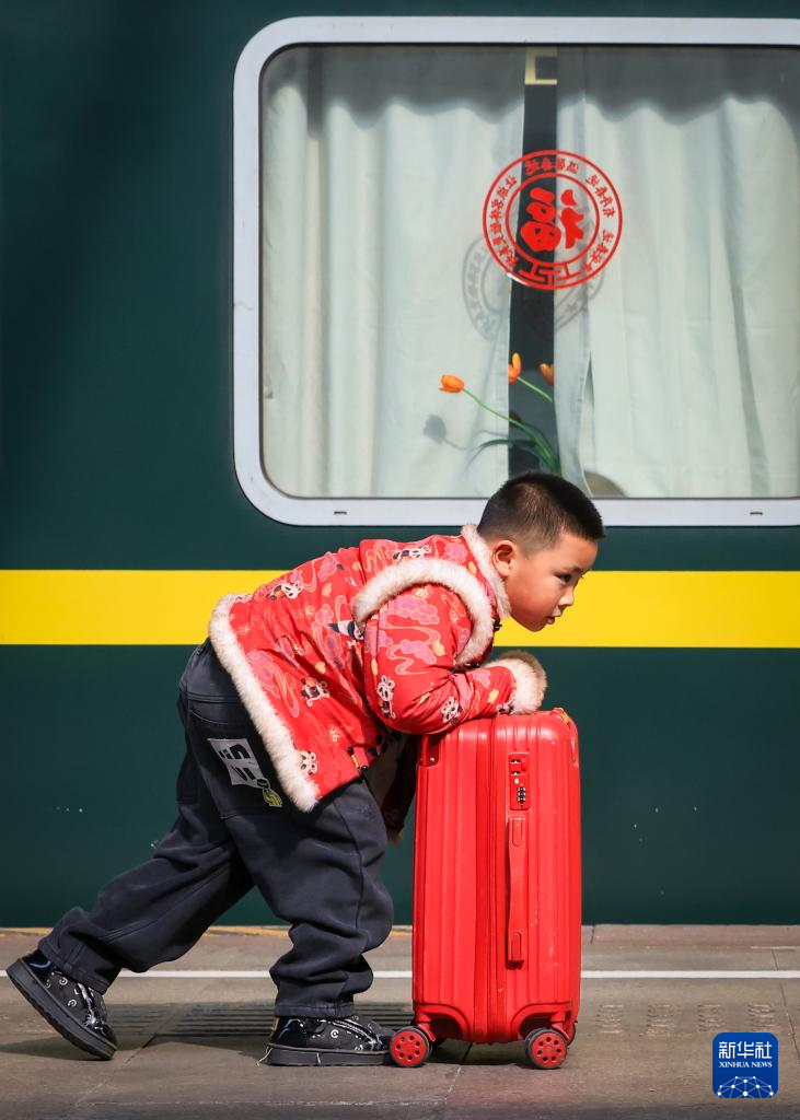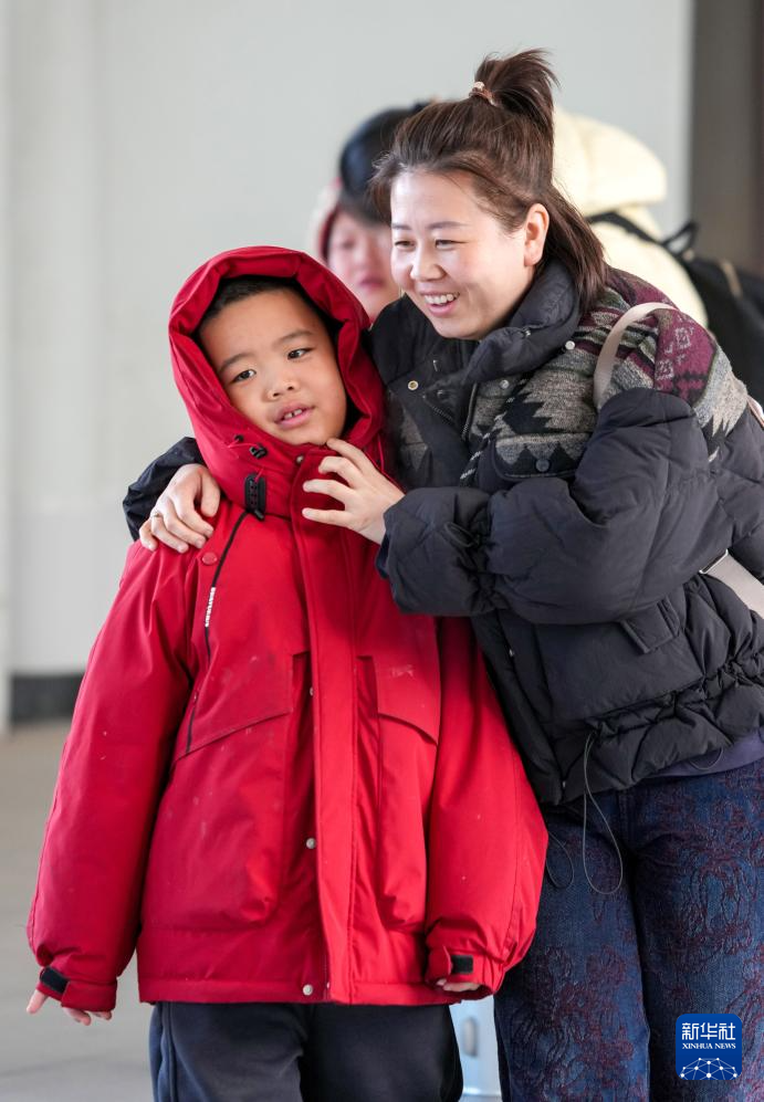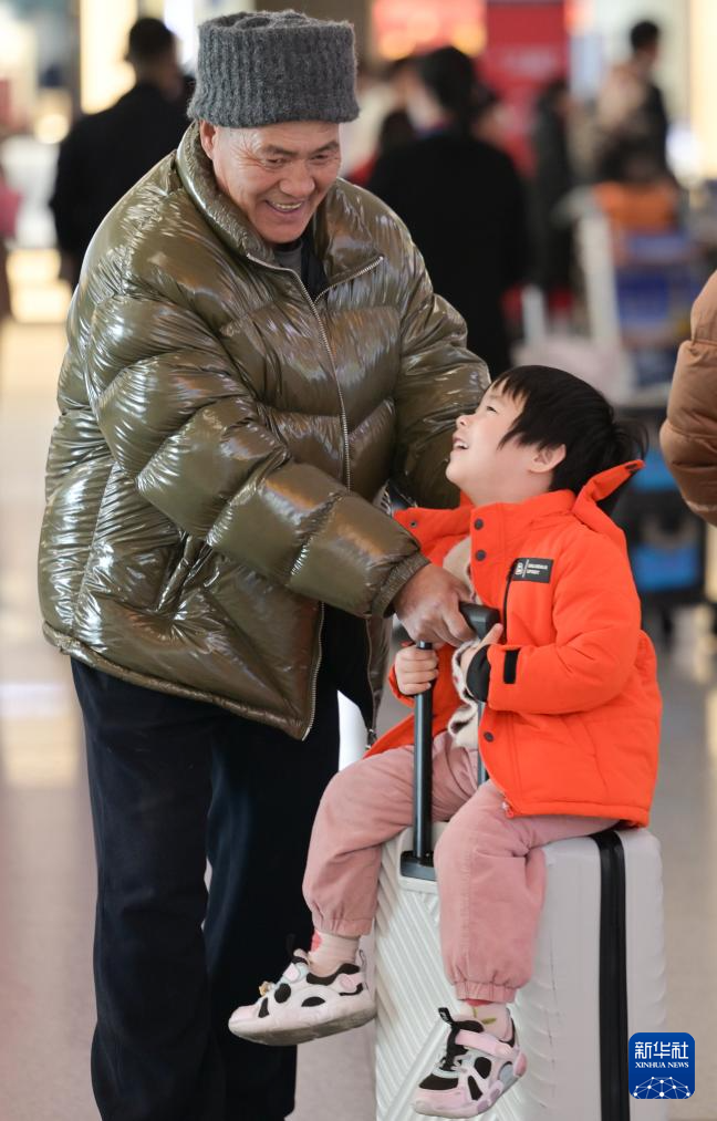 2月2日,在乌鲁木齐站,一名小朋友与家人告别。