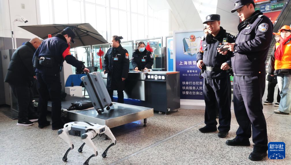 2月2日,在江苏省连云港站,一只机器狗参与安检。