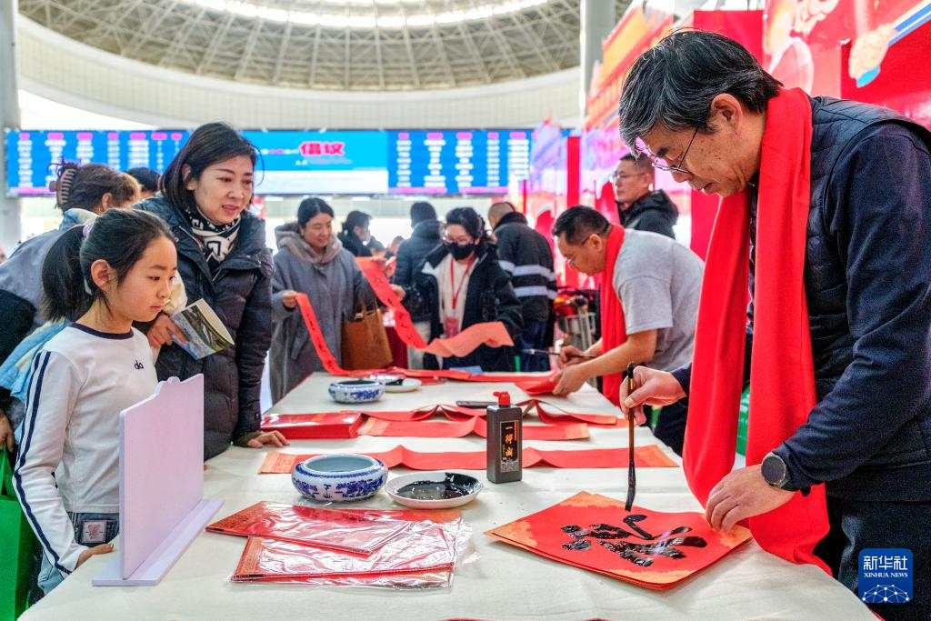 2月2日,在内蒙古呼和浩特市呼和浩特东站,书法家为旅客们现场写春联。