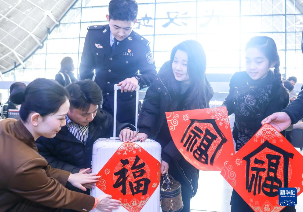 2月2日,在湖北省武汉站,铁路工作人员给旅客送“福”字。