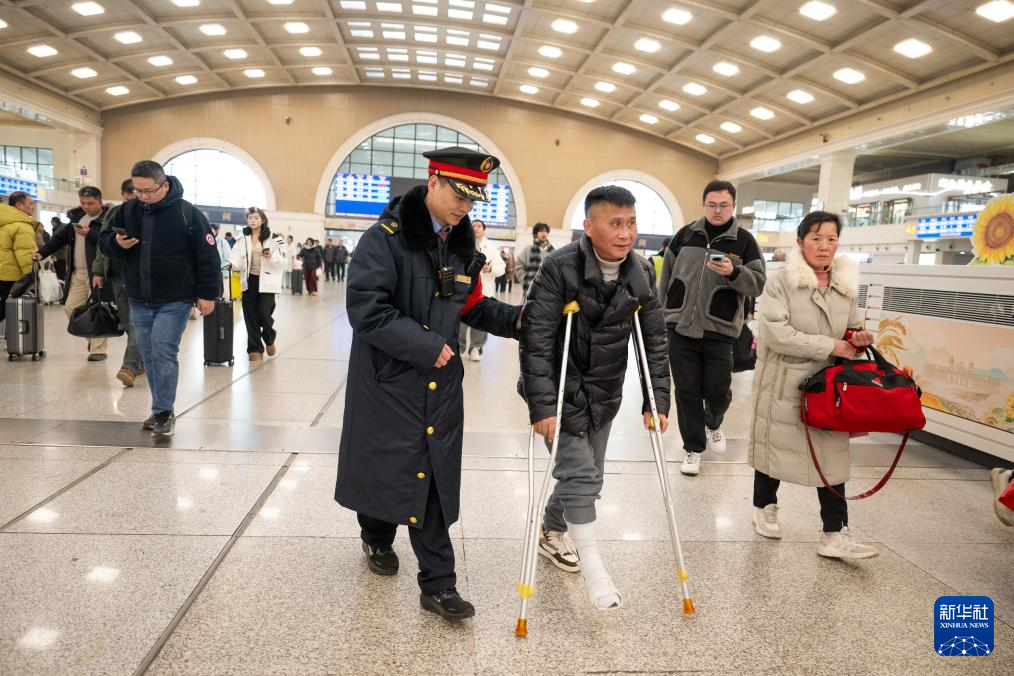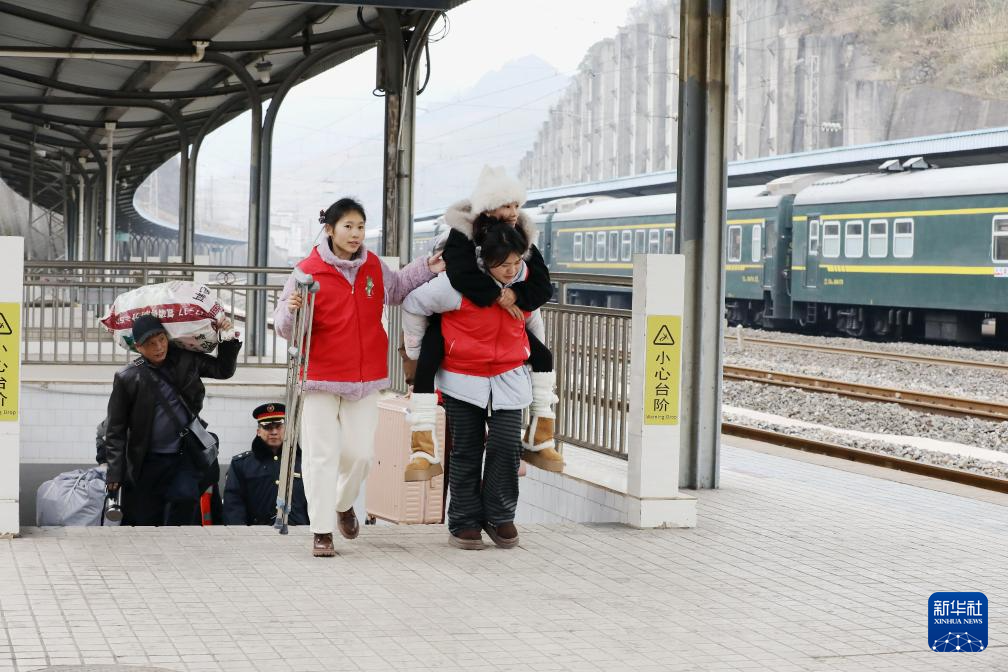2月2日,在贵州施秉站,青年志愿者护送脚部受伤的返乡旅客出站。