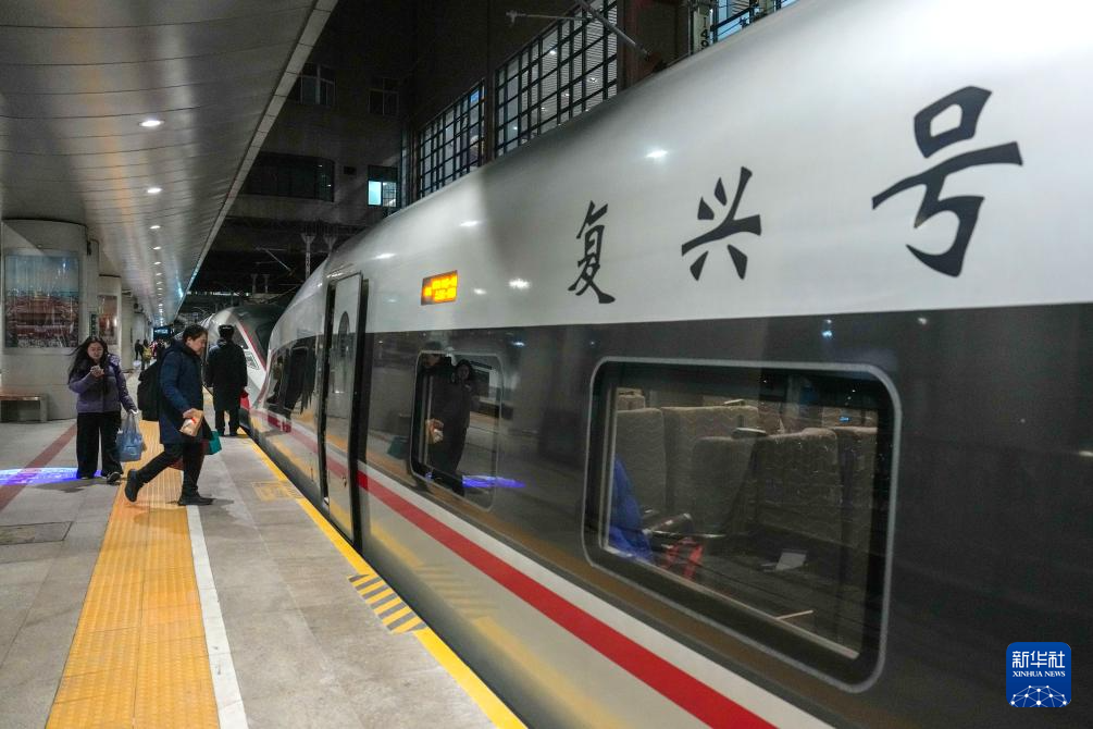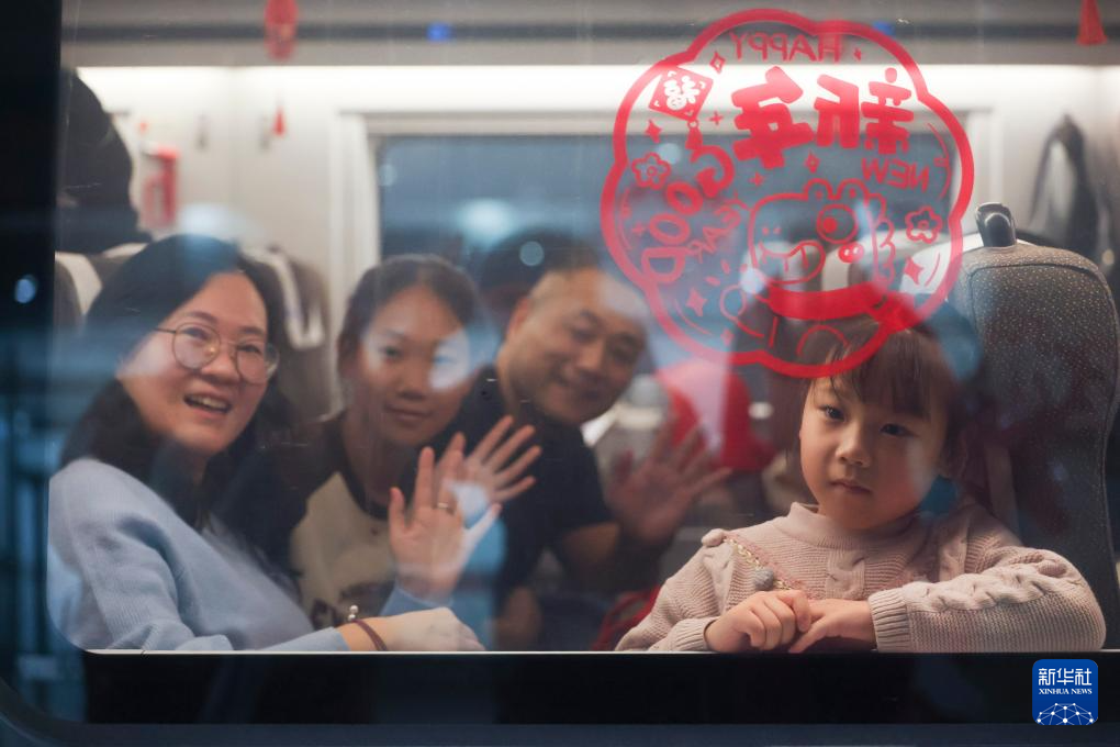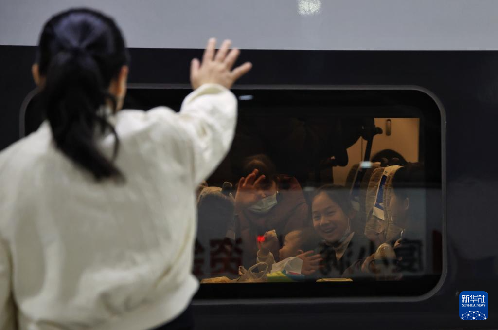2月2日,在上海虹桥火车站,G14列车乘客在发车前挥手告别。