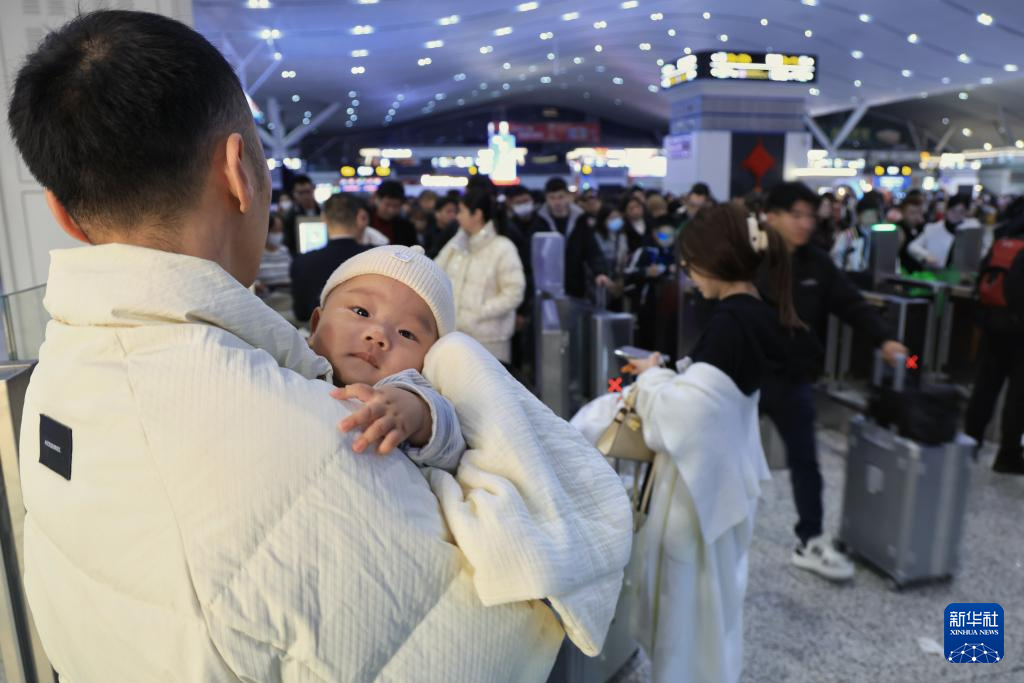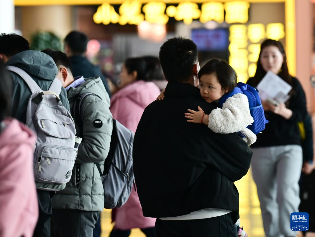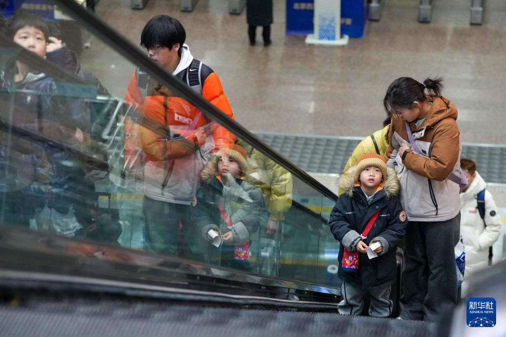 2月2日,在北京西站,小朋友跟随家长进站乘车。
