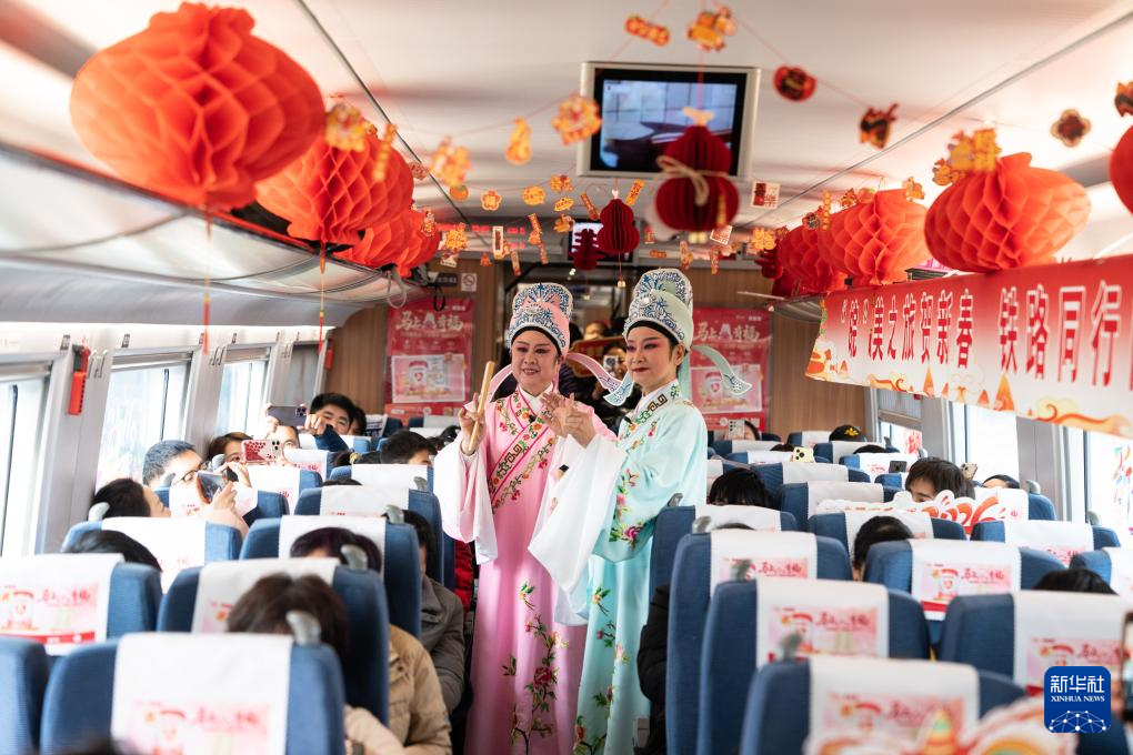 2月2日,演员在合肥南到合肥的G8341次列车上为乘客表演庐剧。