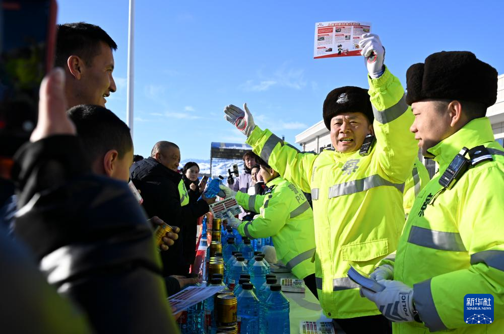 2月2日,在乌尉高速公路永丰服务区,乌鲁木齐市公安局交管支队乌拉泊大队民警向过往司乘人员进行安全出行宣传。