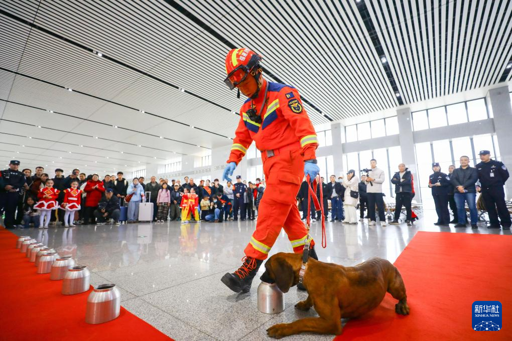 2月2日,在福建三明北站候车厅,消防队员进行搜排爆犬科目表演。