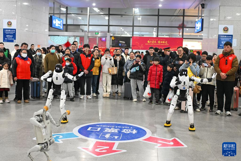 2月2日,机器人在江苏昆山南站候车大厅为旅客表演舞蹈。