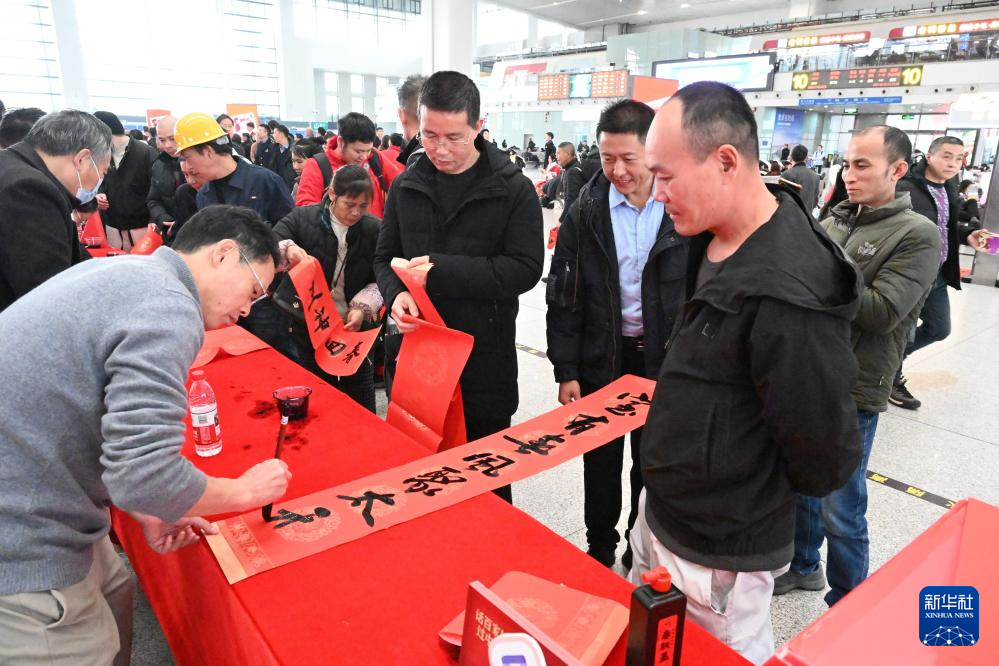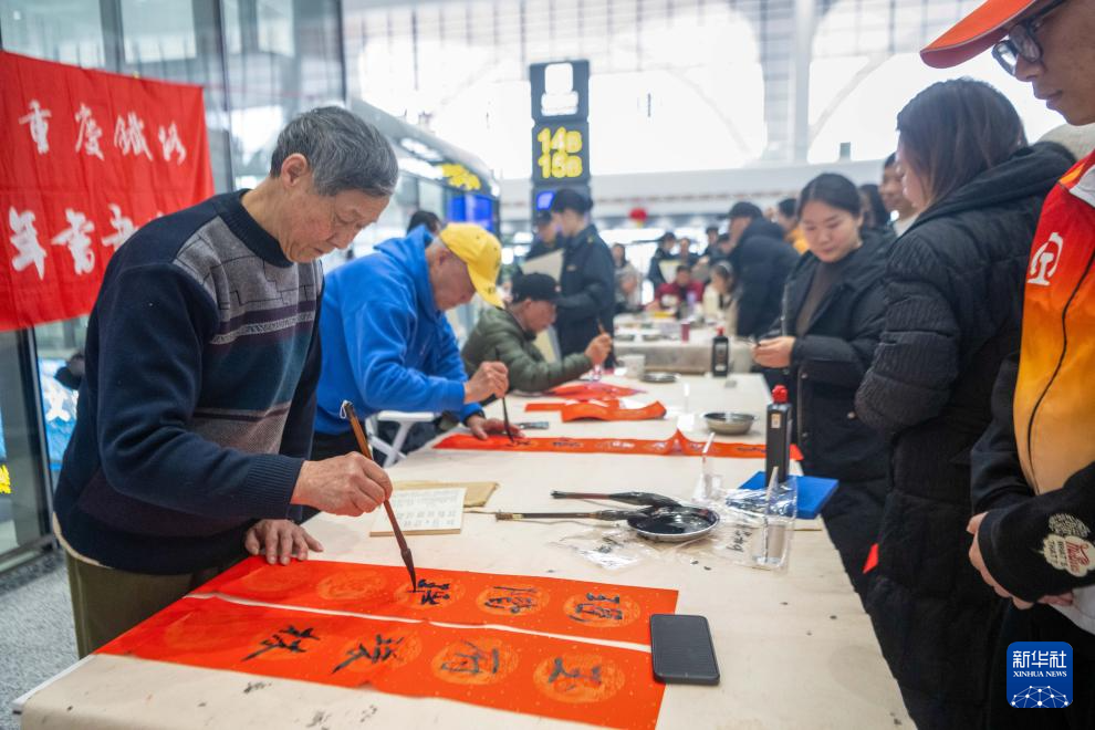 2月2日,书法爱好者在福州火车站书写春联,为旅客送上新春祝福。