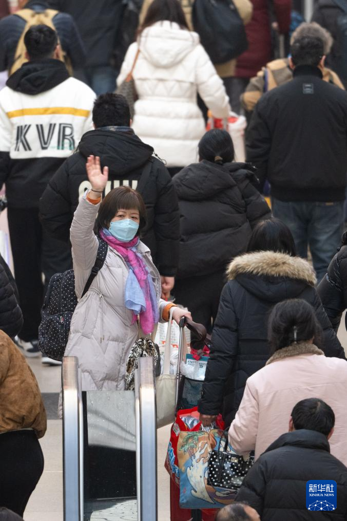 2月2日,在湖北省武汉市汉口火车站,旅客进站时挥手和送行的人告别。