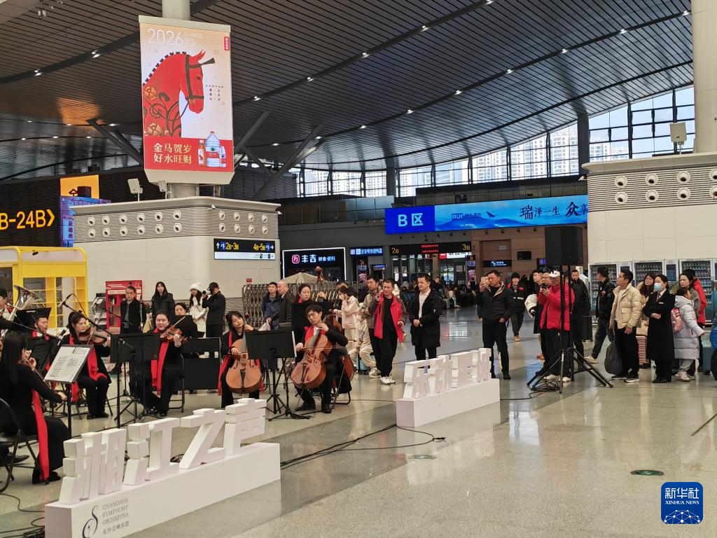 2月2日,旅客在长沙南站候车厅欣赏交响乐演奏。