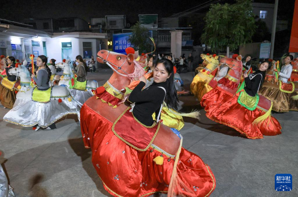 2月4日,在广东省潮州市饶平县霞西村,霞西布马舞队队员进行布马舞排练。