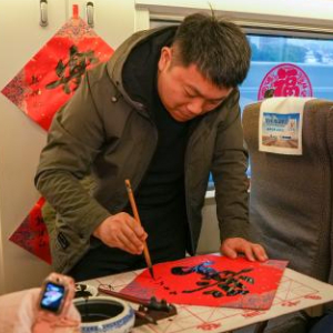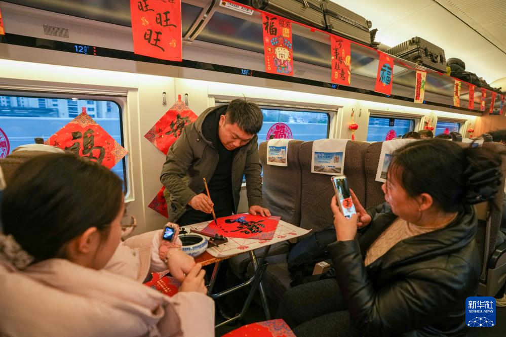 2月6日,书法家在车厢内为旅客们写福字。